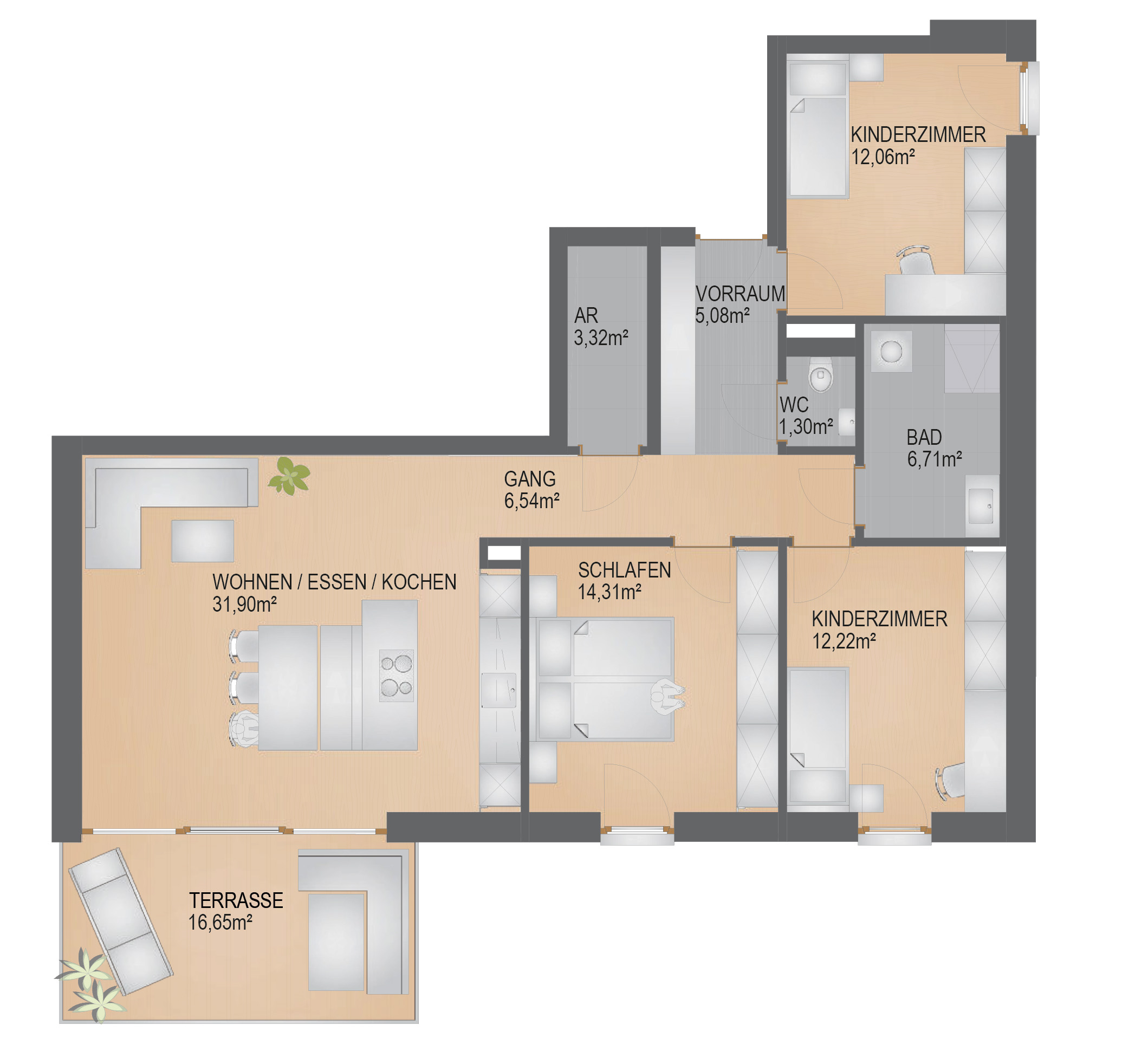 Alle Wohnungen überzeugen mit großzügigen, überdachten Terrassen oder Loggien und sind nach Süden oder Westen ausgerichtet, um Sonne und Ausblick bestmöglich zu genießen.